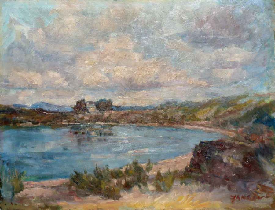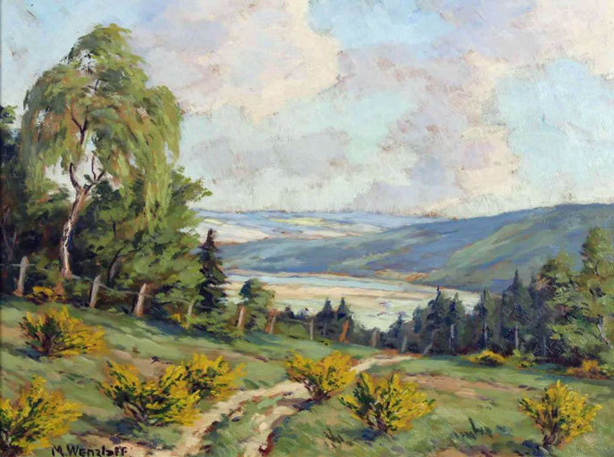 Anmerkung: Das Werk war ursprunglich in einem massiven - leider oben und rechts stark beschädigten - Holzrahmen gerahmt. Die Farboberfläche zeigte Kratzer und mechanische Streifspuren eines offensichtlich rotbraun lackierten Gegenstandes. Eine gründliche Restaurierung ist vorgesehen. Bei der Entrahmung zur ersten Reinigung des Gemäldes wurde auf der Rückseite ein weiteres, unsigniertes Gemälde von Franz M. Jansen freigelegt. Dieses zeigt eine Flußszenerie am Niederrhein. Offensichtlich war dieses Bild zuerst (vor dem "Weinfelder Maar") gemalt und von Franz M. Jansen deutlich größer angelegt worden. Bei der Suche nach einem geeigneten Bildträger für sein "Eifelmotiv" beschnitt der Künstler das Ursprungsbild mit der "Niederrheinischen Szenerie" auf das neue Maß 55,5 x 71,5 cm.